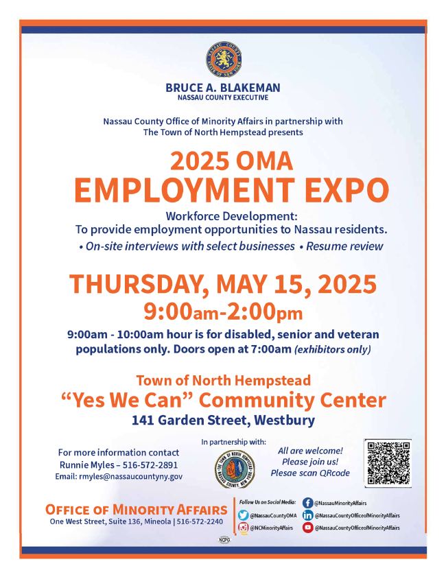We are excited to invite you to participate in the 2025 Nassau County Career & Employment EXPO, hosted by the Nassau County Office of Minority Affairs, Workforce Development Department in partnership with the Town of North Hempstead, on May 15th , 2025!