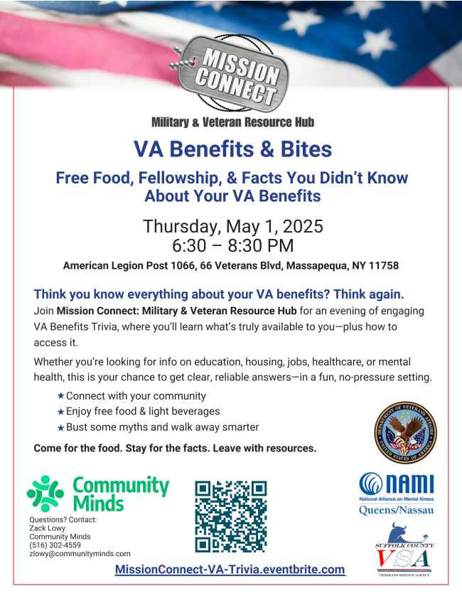 Join Mission Connect: Military & Veteran Resource Hub for an evening of engaging VA Benefits Trivia, where you’ll learn what’s truly available to you—plus how to access it. Whether you’re looking for info on education, housing, jobs, healthcare, or mental health, this is your chance to get clear, reliable answers—in a fun, no-pressure setting. American Legion Post 1066, 66 Veterans Blvd, Massapequa, NY 11758 Connect with your community Enjoy free food & light beverages Bust some myths and walk away smarter Come for the food. Stay for the facts. Leave with resources.