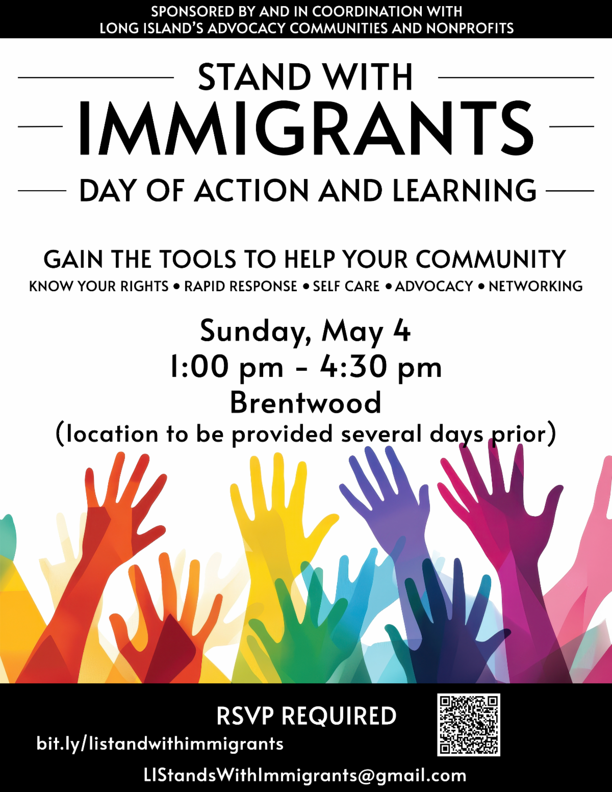 A consortium of Long Island-based nonprofits and associations are hosting an Island-wide Day of Action and Learning in Brentwood on Sunday, May 4, to Stand With Immigrants. It'll be an opportunity to gain/hone the skills needed to advocate on behalf of our immigrant neighbors and to be in community with like-minded fellow Long Islanders. Note that RSVP is required.