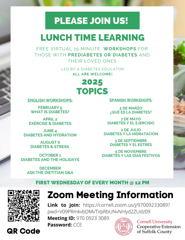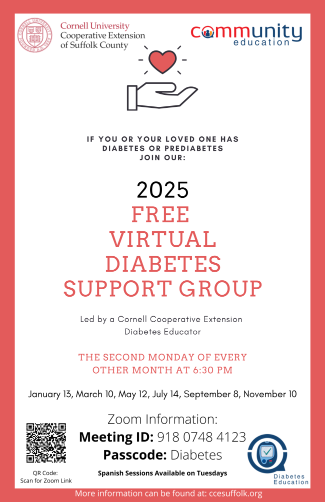 If you or a loved one have diabetes or prediabetes join Cornell Cooperative Extension of Suffolk County's FREE virtual diabetes support group on the second Monday of every other month at 6:30PM.