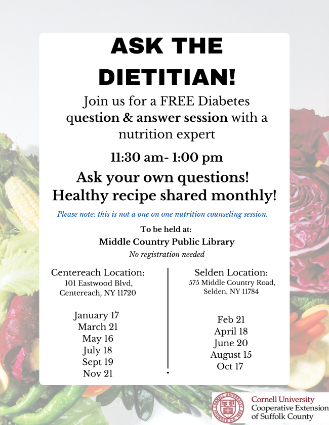 Cornell Cooperative Extension is hosting FREE Diabetes question & answer sessions with a nutrition expert. Ask your own questions, and receive healthy recipes shared monthly. Please note this is not a one on one nutrition counseling session.