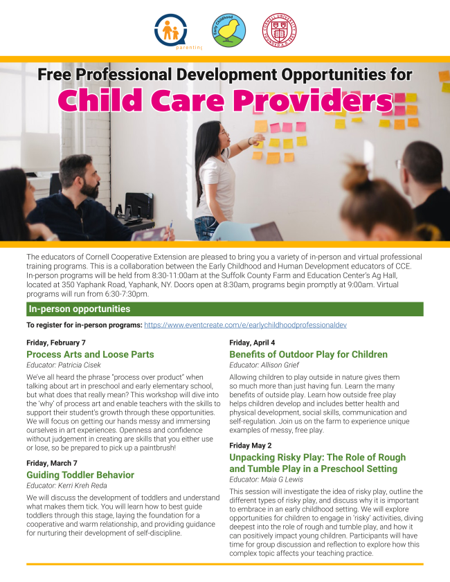 The educators of Cornell Cooperative Extension are pleased to bring you a variety of in-person and virtual professional training programs. This is a collaboration between the Early Childhood and Human Development educators of CCE. In-person programs will be held from 8:30-11:00am at the Suffolk County Farm and Education Center’s Ag Hall, located at 350 Yaphank Road, Yaphank, NY. Doors open at 8:30am, programs begin promptly at 9:00am. Virtual programs will run from 6:30-7:30pm