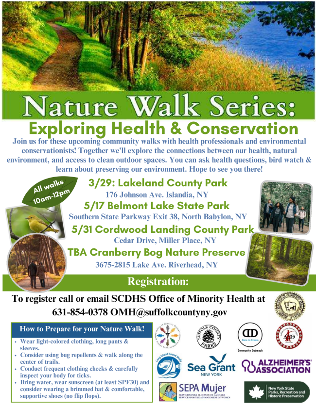 Join the Suffolk County Office of Minority Health for these upcoming community walks with health professionals and environmentalconservationists! Together we’ll explore the connections between our health, naturalenvironment, and access to clean outdoor spaces. You can ask health questions, bird watch &learn about preserving our environment.