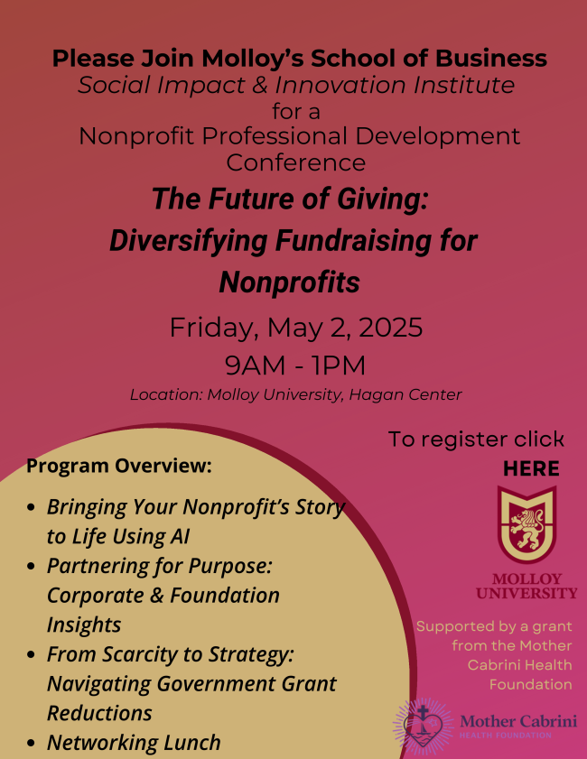 Please Join Molloy’s School of Business Social Impact & Innovation Institute for a Nonprofit Professional Development Conference The Future of Giving: Diversifying Fundraising for Nonprofits Supported by a grant from the Mother Cabrini Health Foundation.