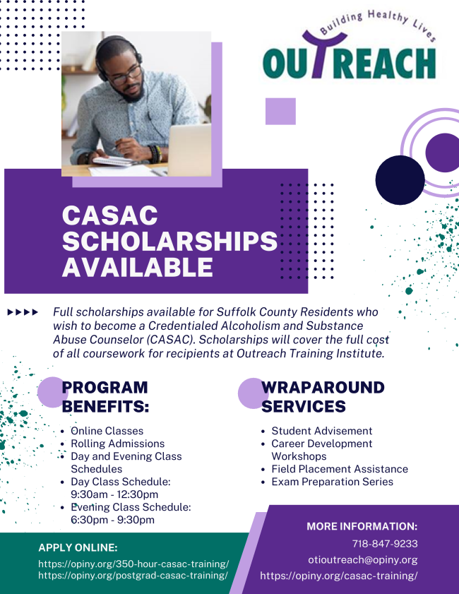 The Suffolk County Department of Health has established full scholarships for Suffolk County residents who wish to obtain CASAC certification at OTI, out of the first phase of the Opioid Settlement funds in Suffolk County. Scholarships will cover the full cost of all coursework for recipients, valued at $5,950 per person. In addition, 40 students will receive paid internships at Outreach, with each receiving a stipend of $1,500.