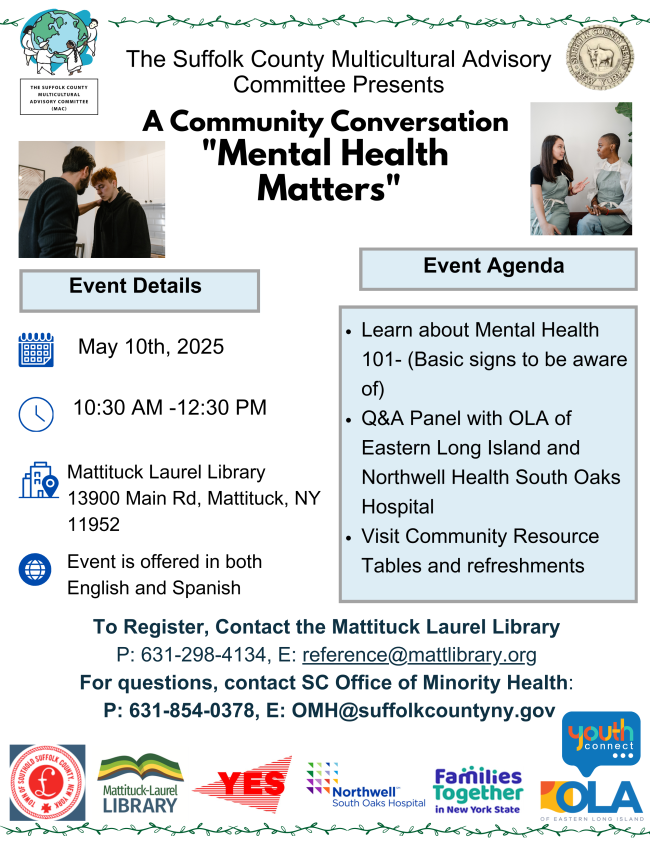 The Suffolk County Multicultural Advisory Committee Presents a community conversation, “Mental Health Matters”.