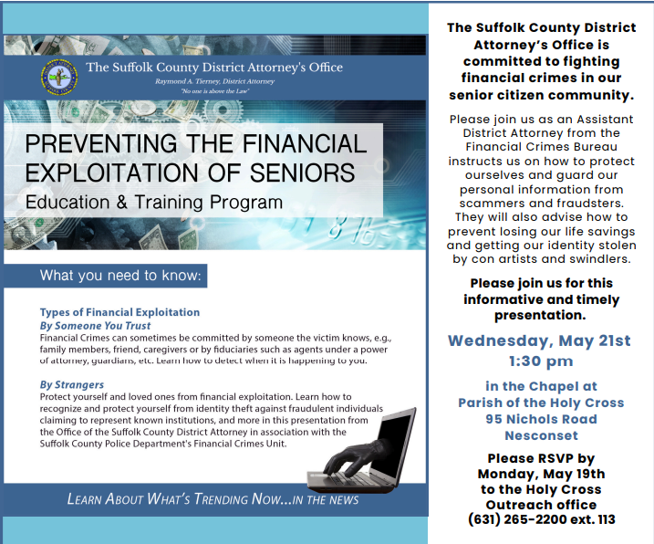 The Suffolk County District Attorney's Office is committed to fighting financial crimes in our senior citizen community. Please join us as an Assistant District Attorney from the Financial Crimes Bureau instructs us on how to protect ourselves and guard our personal information from scammers and fraudsters.They will also advise how to prevent losing our life savings and getting our identity stolen by con artists and swindlers. Please join us for this informative and timely presentation.