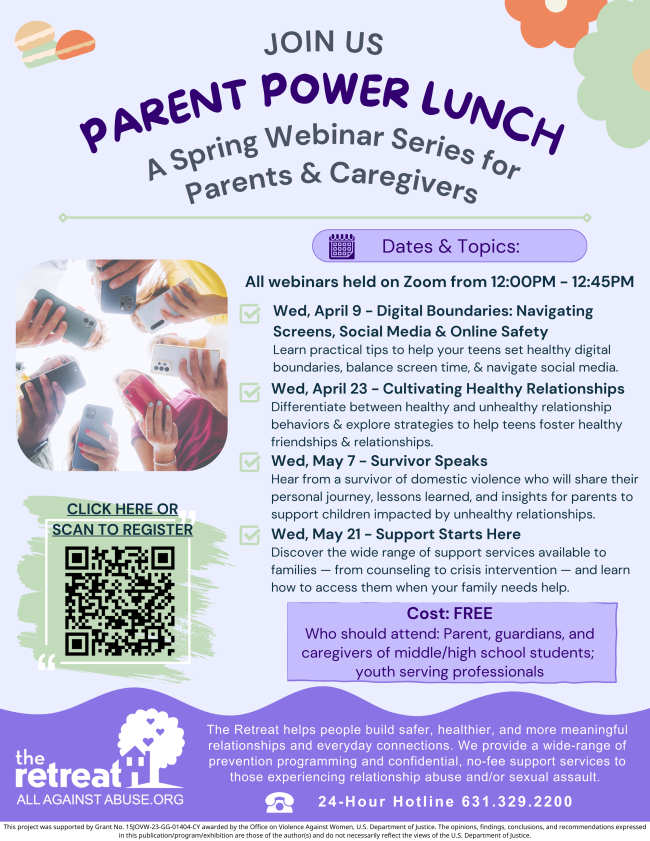 Join The Retreat for Spring Parent Lunch & Learn, a free webinar series designed to support parents and caregivers in fostering healthy relationships and safe digital habits for their children and teens. Each session will cover essential topics, from setting online boundaries to accessing community resources. Attend one or all — your choice!