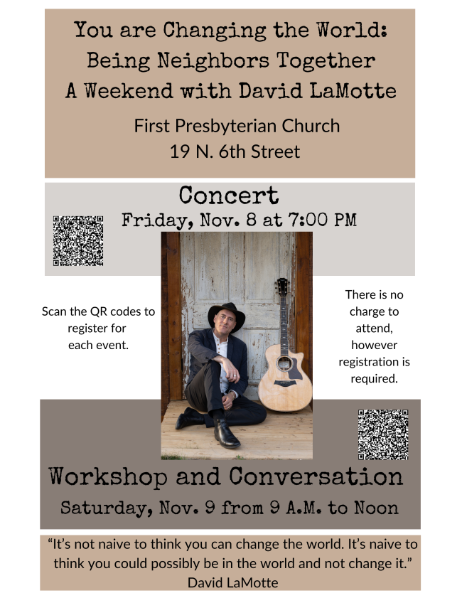 Beloved by Presbyterians and world renowned, David will be performing a concert at FPC on Friday night at 7 PM and on Saturday from 9 am to 12 he is presenting a workshop on being neighbors, being together as the body of Christ, and how we are changing the world simply by being in it.