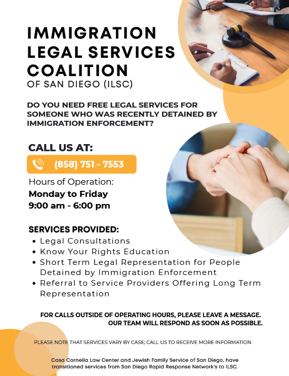 Community members in immediate need of legal support may contact the ILSC hotline at 858-751-7553. While the ILSC does not collect, confirm, or share real-time information about specific immigration enforcement activities, individuals may call to request legal support for themselves or someone they know who has been detained during such an action.