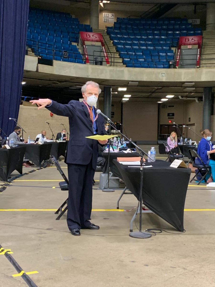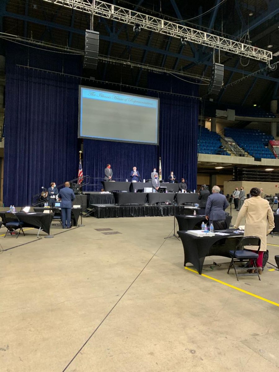Coming back to session after a long absence usually involves a lot of handshakes and hugs, comparing notes on trips taken or projects undertaken, and for me it always involves sharing baked goods. This was a very different experience. Arriving at the Bank of Springfield Center where we've established our temporary House chamber, we were greeted by protestors, many carrying the all too familiar offensive signs bearing swastikas or anti-Semitic slogans. Once inside, we faced a temperature check and metal detectors before being allowed into the chamber where our new desks were arranged roughly in the same way as in the Capitol, only separated by more than 6 feet each. Instead of our usual greetings, folks complimented each other's masks, commented on newly grown out hair and asked about families.