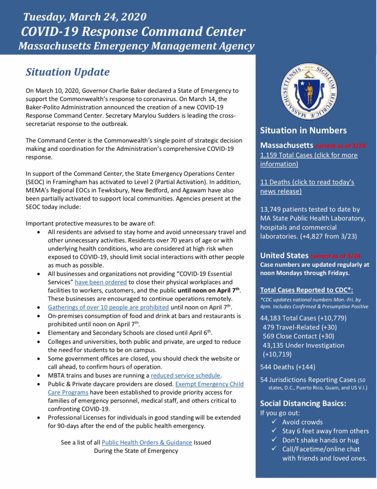 Last week and again on March 24th, Secretary Mary Lou Sudders, who the Governor appointed to lead the COVID-19 Response Command Center, held a conference call with Legislators to provide several timely updates and to solicit our feedback on what challenges we were hearing about in our communities. The Command Center also provides us with a Daily Situation Report with important updates at the end of each day. You can see the first page of the update for Tuesday, March 24th below: