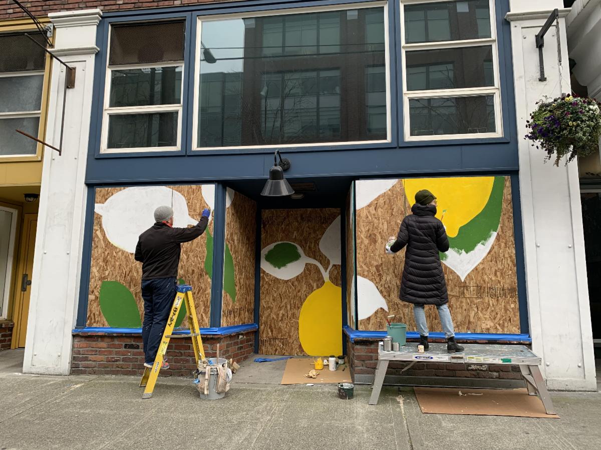 studio e gallery) entitled Fragrant Lemon. While Fragrant Lemon will open as soon as Fruitsuper/Foundry Vineyards are able to open, the businesses decided to bring a little joy and spot of brightness to the neighborhood while bringing the art show from inside to share with the outside. And to simply celebrate art, staying positive, and making the most of this situation. The Alliance for Pioneer Square does not encourage businesses to board up windows. However, if your business is boarded up and are seeking art to adorn boarded up windows, please reach out to sara@pioneersquare.org
