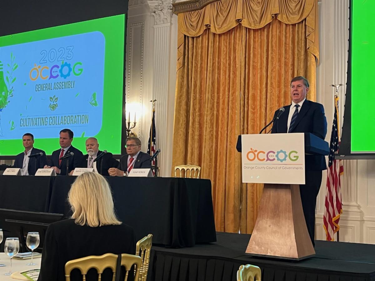 Serving as Master of Ceremonies, Curt Pringle introduced the Transportation panel at OCCOG GA 2023. | |