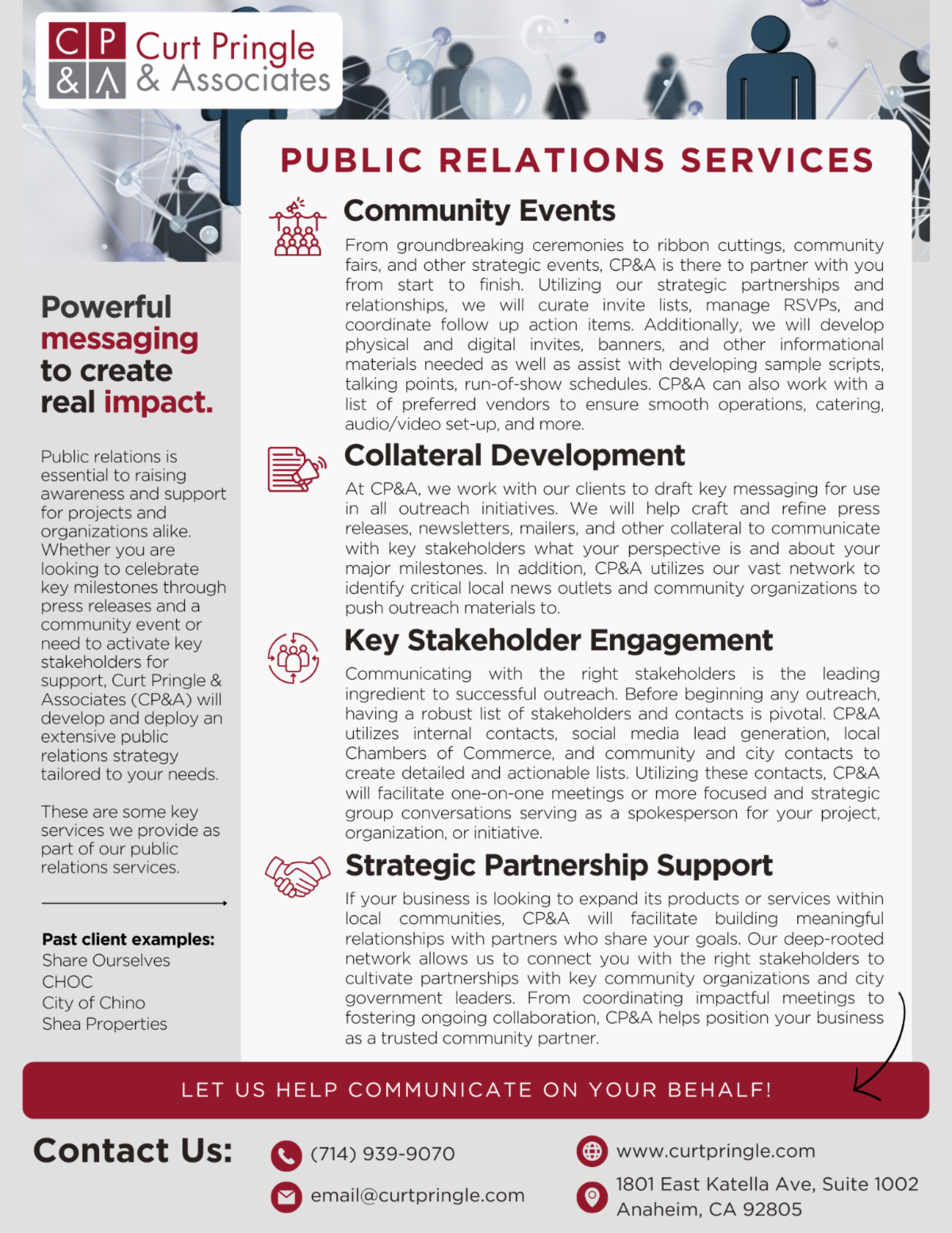 A key service we offer to many of our clients is public relations support. From curating stakeholder and media lists to helping you host strategic events and produce press releases and newsletters, CP&A can augment your team to achieve your PR goals. With over 25 years of experience and countless community contacts, we would love to partner with you.