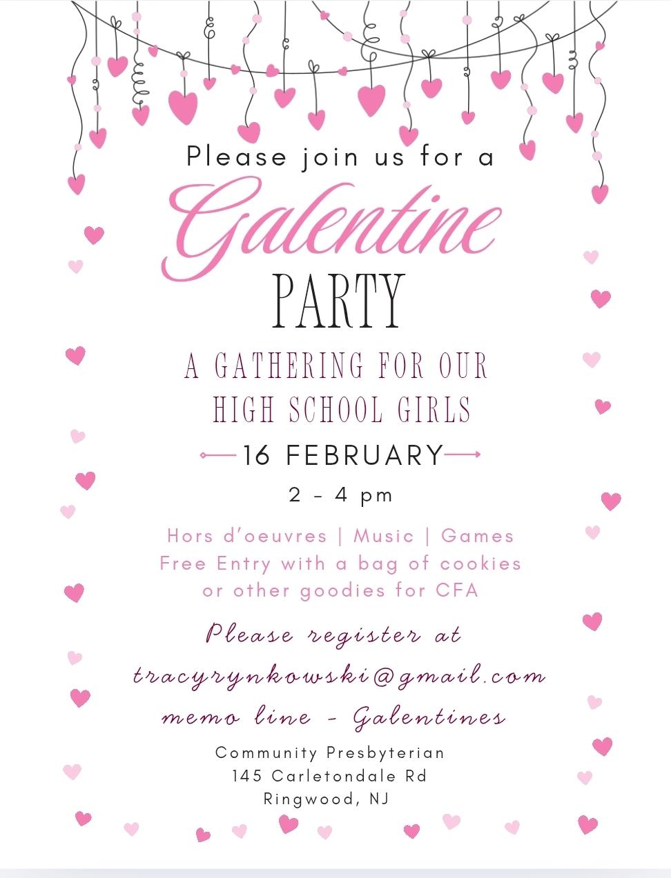 Calling all High School girls! Join us for a celebration of you on Monday, Feb 16th, from 2 - 4 in the Fellowship Hall. Come for some girl-time, some yummy goodies, a few prizes and fun. Please RSVP to Tracy @ tracyrynkowski@gmail.com by Feb 12th so I can make sure to have enough prizes and goodies.