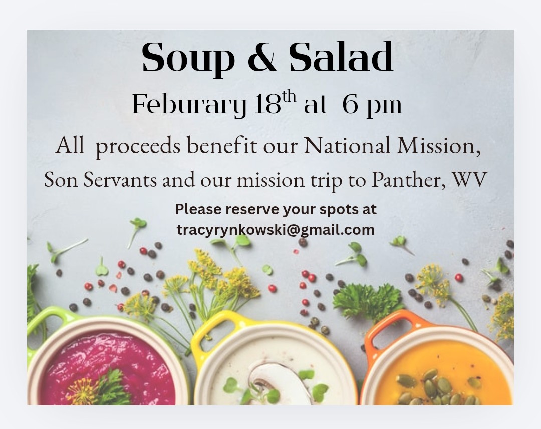 It’s that time again! We are so excited to be hosting our now, Annual Soup and Salad Dinner to benefit our National Mission - Son Servants. Dinner will be at 6 pm on Ash Wednesday just before our service at 7:30. Take the night off from cooking and help our mission team get to Panter, WV this summer. PLEASE - sign up via email to Tracy @ tracyrynkowski@gmail.com or in person at our next two coffee hours. We can’s wait to spend dinner with you!