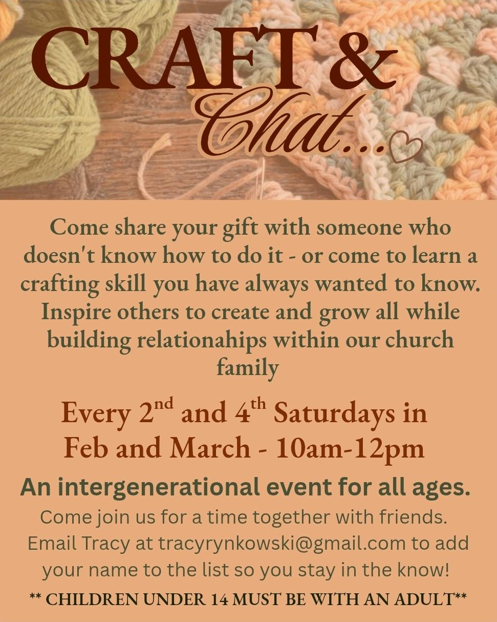 Calling all crafters - and want to be crafters (of all ages)! Please come join us for a time of sharing and visiting the 2nd and 4th Saturdays in Feb and March. If you already have a crafting skill or a project you are working on bring your supplies and come work together as a group. If you want to learn to knit, crochet, paint make paper crafts etc - come with an open and excited heart. These are not “classes” where one person teaches the entire group - it is just a gathering to share skills, supplies and stories. Please sign up for communications and information with Tracy at tracyrynkowski@gmail.com or in person this Sunday at coffee hour.