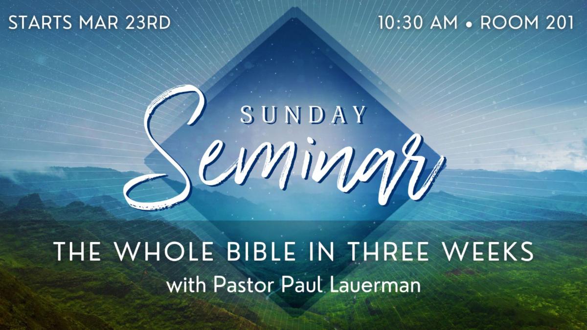 Sunday Seminar Series — “The Whole Bible in 3 Weeks”: The Bible is a masterpiece: 1,700 pages, 66 books, written over 1,500 years by at least 40 different authors. Yet, it tells one unified story. How is that possible?