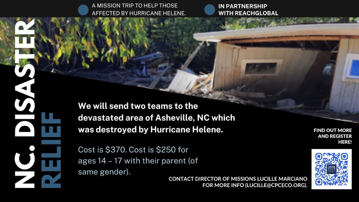 We are going to the Asheville area of NC to help with relief efforts from hurricane Helene. The restoration work will take between 3 and 5 years for the area to recover. The first trip is May 4-9 (Sunday through Friday) and is limited to 6 people. We will also send a larger team October 26-31. You can register here for the May trip at Disaster Relief May 2025. Contact Director of Missions Lucille Marciano for more information. | |