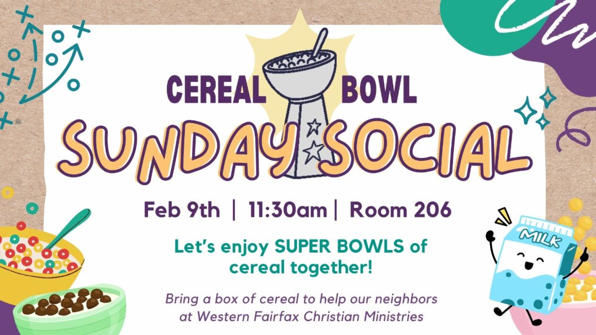Get ready for Super Bowl Sunday by joining us for our 2nd annual “Cereal Bowl Sunday”. Wear your favorite jersey, have a bowl of your favorite cereal, and bring a box of cereal to donate to Western Fairfax Christian Ministries. You don’t want to miss it! Join us, Feb 9th, in 206 following the 10:30 service. | |