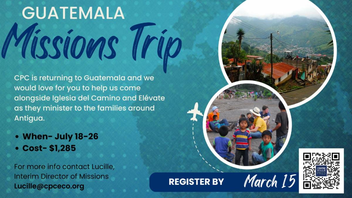 Guatemala 2025, July 18-26. CPC is returning to Guatemala and we would love for you to help us come alongside Iglesia del Camino and Elévate as they minister to the families around Antigua. Registration is open and you can sign up here at Guatemala 2025. Contact Director of Missions Lucille Marciano for more information.