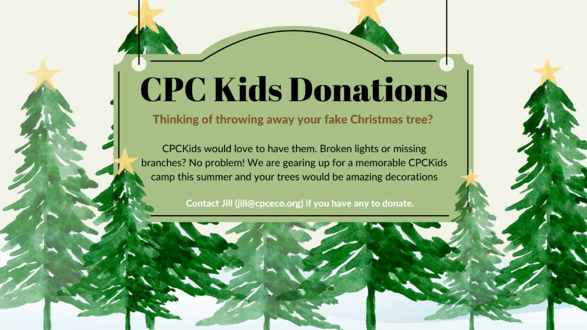 CPCKids Donations: Thinking of throwing away your fake Christmas tree? CPCKids would love to have them. Broken lights or missing branches? No problem! We are gearing up for a memorable CPCKids camp this summer and your trees would be amazing decorations. Contact Jill if you have any to donate. | |