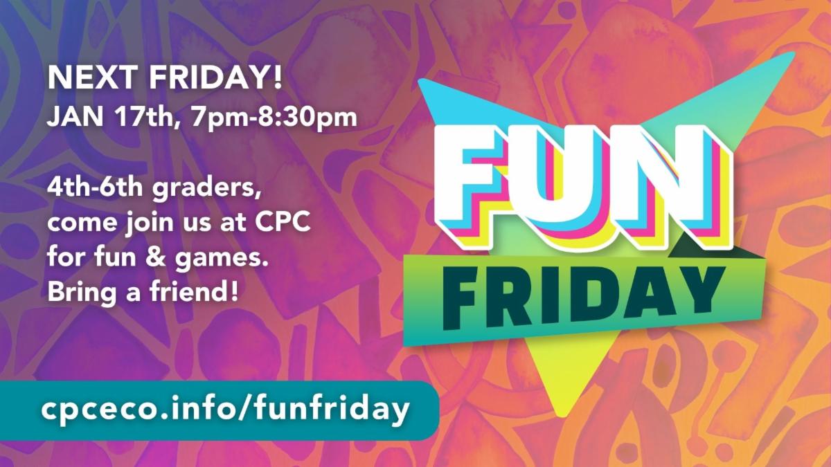 Fun Friday!: 4th - 6th graders, our next Fun Friday is Jan 17th, 7-8:30pm. Bring a water bottle and invite your friends. Remember - if you have already registered for a past Fun Friday, you are good for the school year. First time attending? | |