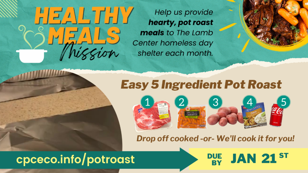 Every month, we have an incredible opportunity to serve the Lamb Center, a day shelter for homeless men and women, by preparing and delivering pot roast meals.