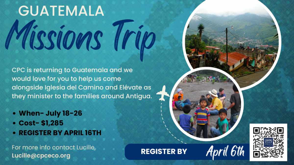 | | CPCKids Camp 2025. Registration is open! Let's have mountains of fun at CPCKids Camp 2025, July 8th - 11th, 9:30am-12pm. At our 4-day camp, True North, kids (PreK-5th grades) will discover that they can trust Jesus in our wild world. It sure is wild, isn’t it? Each day will be filled with memorable Bible-learning experiences, hands-on science experiments, team-building games, and unforgettable Bible songs that will help faith flow into real life. Register using the Church App or click the link below. If you have questions or want to serve at camp contact Jill. | | Guatemala 2025. July 18-26. CPC is returning to Guatemala and we would love for you to help us come alongside Iglesia del Camino and Elévate as they minister to the families around Antigua. Registration is open and you can sign up here at Guatemala 2025. Contact Director of Missions Lucille Marciano for more information. | | Farthest Corners Benefit Dinner. Saturday, April 5th at the Inn at Vint Hill. There will be an appetizer, Social Hour & Silent Auction at 5:30 pm, dinner at 6:30 pm, and dessert & Live Auction at 7:30 pm. Tickets are $50 a person, you may purchase your tickets here. Childcare at the church is available during the event. Contact Sue Ellen Kinser to register. | | Men’s Ministry God’s Garden Refurb. The men of the church are doing a complete teardown and refurbishment of God's Garden this spring. The gardeners share their proceeds with others including the local food pantries. We are looking for a total of 8 volunteers on 3 consecutive Saturdays from 9am-noon starting Saturday March 15th. If you would like to help, sign up here! | | Camp Highroad Day. Rising 4th - 6th graders, registration is open for our adventure day, August 4th, 9:00 am - 4:00 pm, at Camp Highroad in Middleburg, VA. We will be doing a challenge course, rock wall, hayride, and zip line! We will meet at CPC at 9:00 am and travel together in the church van so we have limited spots. | | Men’s Gettysburg Battlefield Trip. On Saturday April 26th, the men’s ministry will be taking a day trip to the Gettysburg Battlefield. We will leave the church at 7am, drive to the battlefield where our expert guides will give us a tour, and we will finish up in PA around 5:00pm. Staying for dinner is optional. The trip is free with the exception of food costs. Register here | | Dear CPCKids Families, On Easter Sunday, April 20th, we’ll celebrate the resurrection of Jesus with worship services at 9am and 11am. Nursery will be provided at both services. At the 11am service, there will be class for PreK-K only. We welcome 1st - 5th grades in worship for Easter Sermon Bingo. | | |