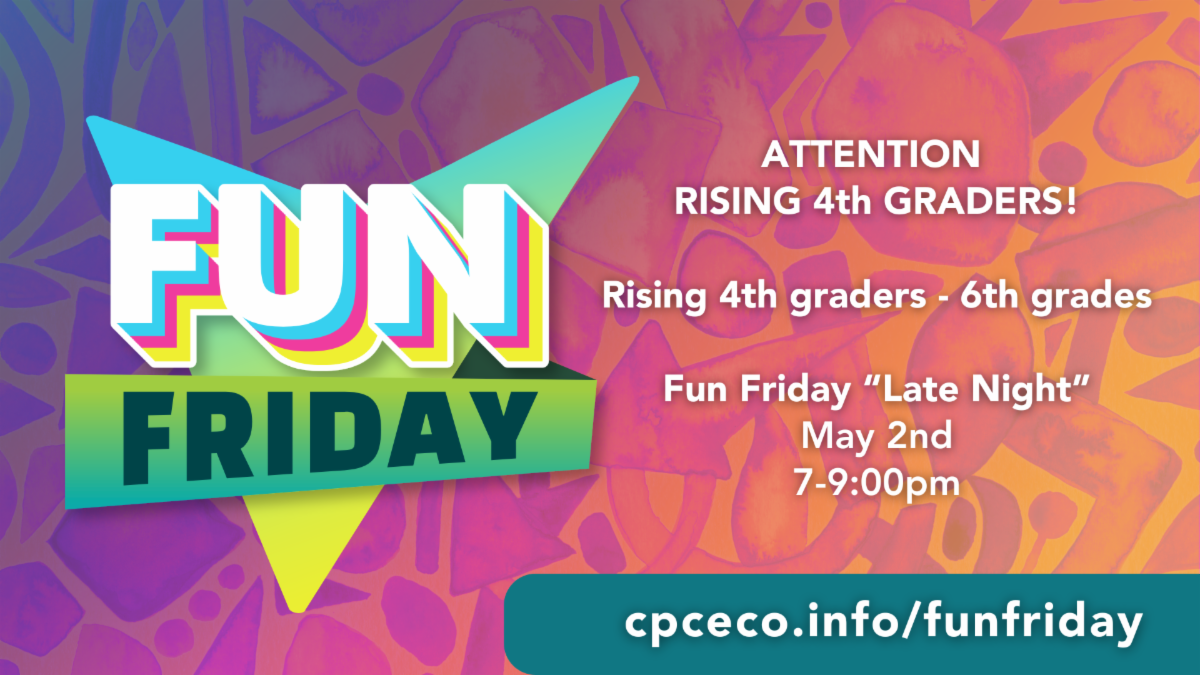 Late night edition! 4th - 6th graders, our last Fun Friday of the school year is May 2nd. Come to Fun Friday “Late Night” when we extend our time until 9pm and invite rising 4th graders to come check out how we put the FUN in Fun Friday. Be sure to bring a water bottle and invite your friends. First time attending? If you have any questions Contact Jill