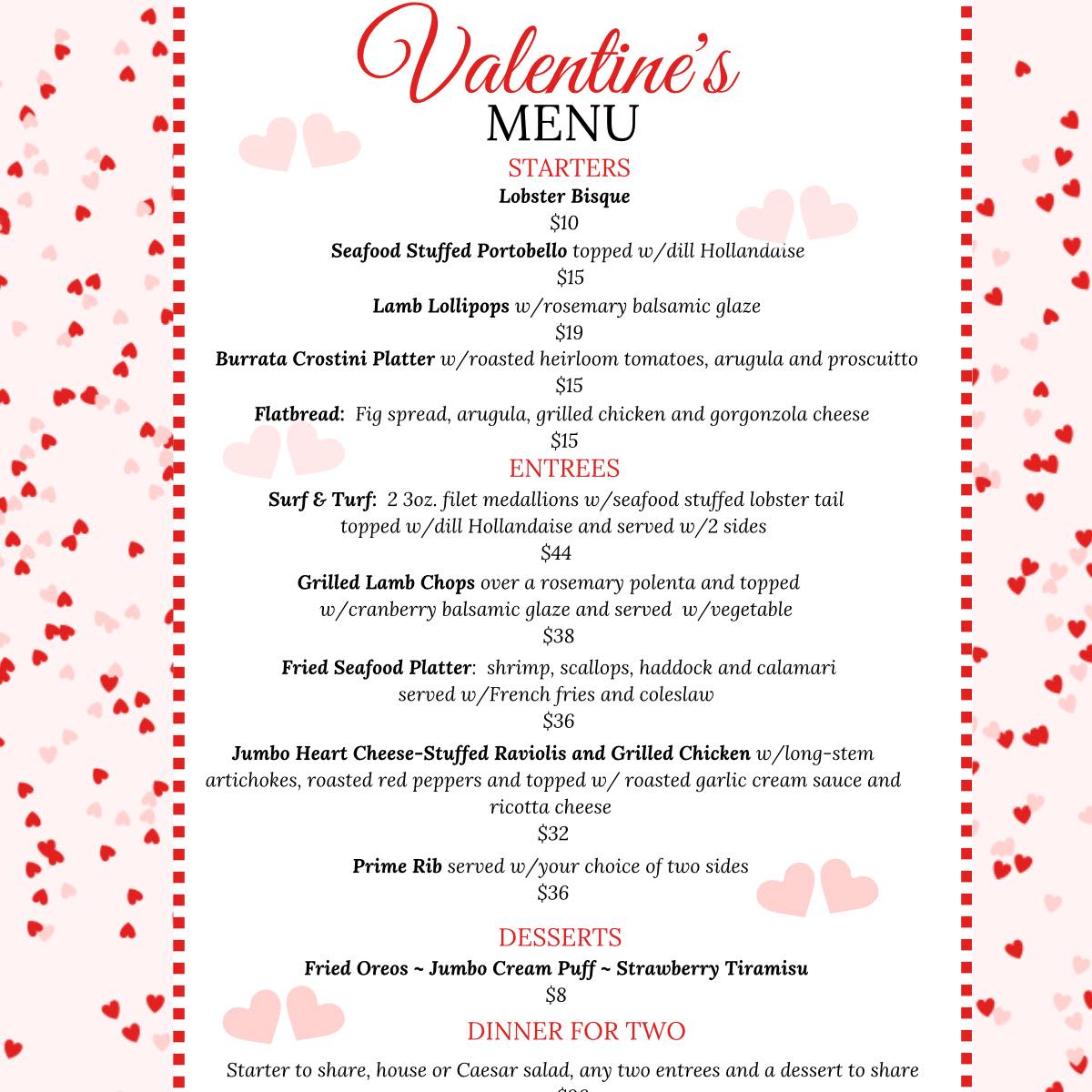Valentine's Menu available Friday, February 14th, starting at 4 pm, and again on Saturday, February 15th , starting at 4 pm, while supplies last. Call to make your reservation, 774-449-8333.
