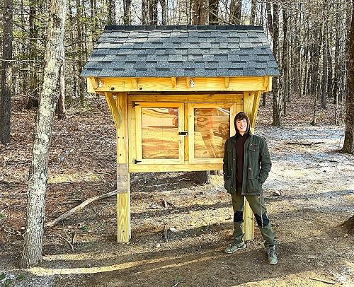 Photo: Jonah Scherer standing next to the recently completed kiosk for the Tantasqua Trail system.