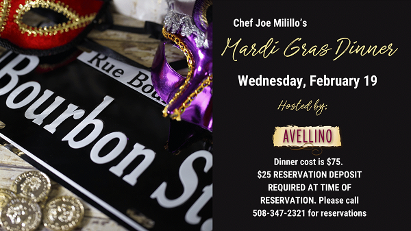 AVELLINO will host a MARDI GRAS DINNER, capturing the vibrant spirit of New Orleans. The evening will feature a festive atmosphere and a SPECIALLY CURATED MENU CRAFTED BY HEAD CHEF JOE MILILLO AND HIS TALENTED CULINARY TEAM.