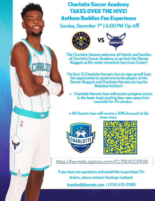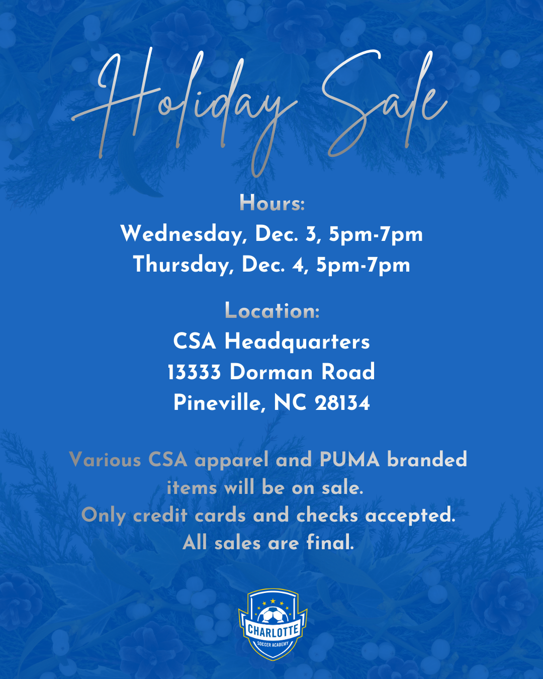 A couple of highlights for this month include our Winter Training program that starts this week. For those who haven't registered, you can still sign up on the first day of camp, and the walk-up fee has been waived. This is an opportunity to keep touches on the ball during the off-season. Also, we recently announced we will have our first CSA Night at the Charlotte Hornets on December 7. CSA members may have an opportunity to be part of the fun. Lastly, we do have our Annual Holiday Sale this week for two days only at the CSA main office. Take advantage of discounted prices on CSA branded merchandise and PUMA apparel. Information on these highlights and more can be found below in the club news section.