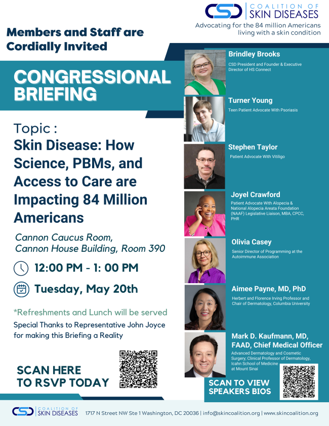 The CSD is thrilled to announce its amazing lineup of speakers at the CSD Hill Day Congressional Briefing in Washington, D.C.! The briefing, held on Tuesday, May 20 from 12PM - 1PM in the Cannon Caucus Room of Capitol Hill, will feature inspiring skin disease patient advocates and prominent researchers and providers. This is an incredible opportunity to educate and bring awareness of skin disease to Members of Congress, their staffers, and federal agency employees. Please share this invite far and wide with your networks!