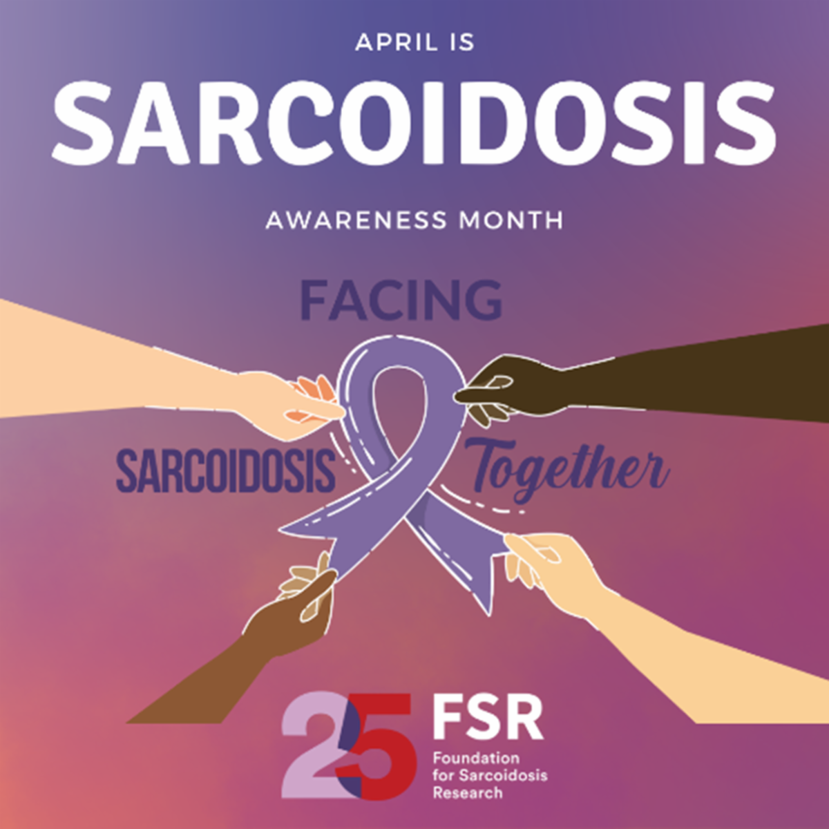 This year is especially meaningful as Foundation for Sarcoidosis Research (FSR) celebrates 25 years of progress. Our theme, "Facing Sarcoidosis Together," highlights the power of community in tackling this disease. Whether you're a patient, caregiver, or ally, your voice can make a difference. Join us in spreading awareness and taking action! Get involved today – learn more at https://www.stopsarcoidosis.org/ and take a look at this social media toolkit!
