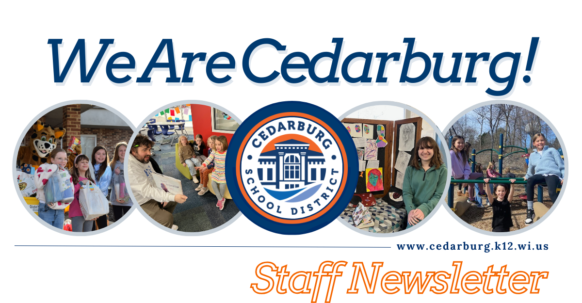 DISTRICT MISSION: The mission of the Cedarburg School District is to provide an exemplary education that challenges students in a nurturing environment to develop into lifelong learners, to become responsible adults, and to achieve their goals and dreams. | | ℂ𝕖𝕝𝕖𝕓𝕣𝕒𝕥𝕚𝕟𝕘 𝕊𝕥𝕒𝕗𝕗 𝔼𝕩𝕔𝕖𝕝𝕝𝕖𝕟𝕔𝕖 | | This year's staff newsletter will be published on the second and fourth Tuesday of each month. Contributors could be any district-level department. It is designed to provide you with a culmination of essential information. We hope this is helpful. If there is something you would like to see in a future issue, let us know. | |