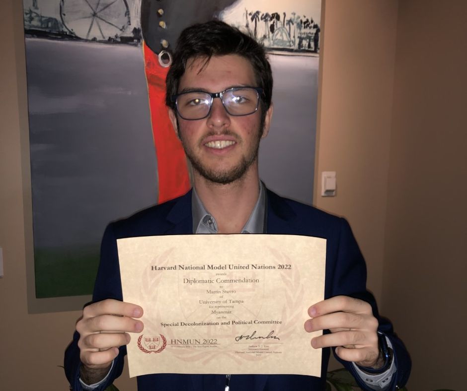 Political Science major Martin Stavro received Diplomatic Commendation at the Harvard National Model United Nations (HNMUN) 2022 conference this month where he represented Myanmar in the Special Political and Decolonization Committee. This year’s event brought together 1,200 students from around the world to compete in its 68th annual HNMUN.