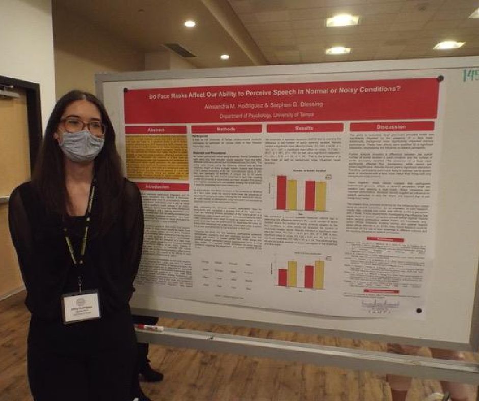 Psychology major Alexandra M. Rodriguez in collaboration with her mentor, Professor of Psychology, Stephen Blessing presented research at the 2022 Undergraduate Research Conference in Orlando. The presentation titled "Do Face Masks Affect Our Ability to Perceive Speech in Normal or Noisy Conditions?" examines the influence face masks may have on speech perception in noisy and normal conditions.