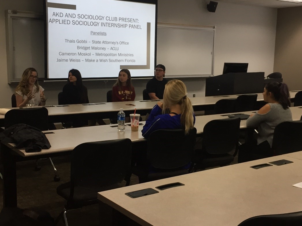 On November 15, 2019, Alpha Kappa Delta (AKD) and the sociology club co-hosted an Applied Sociology Internship Panel. During the panel, sociology students and alumni spoke about their experiences with sociology internships and the SOC480 experience