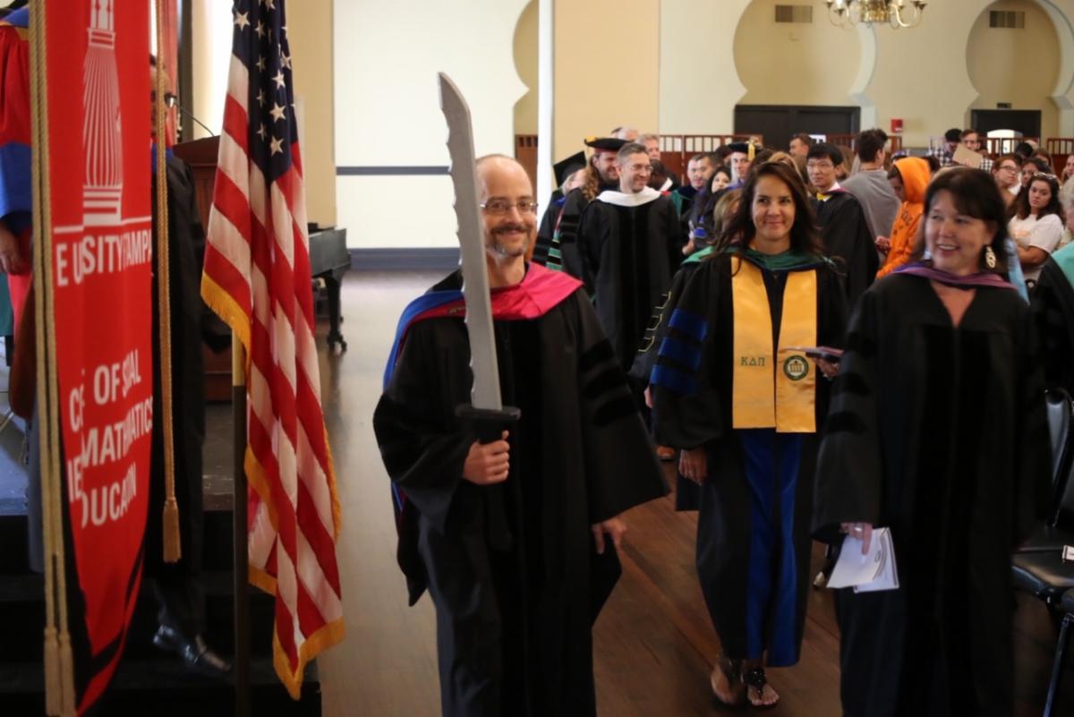 Associate Professor of Mathematics John Sumner as the Gonfalonier, entered to mark the beginning of the first CSSME Convocation. After the processional,