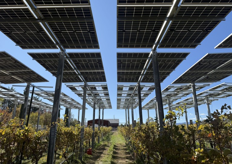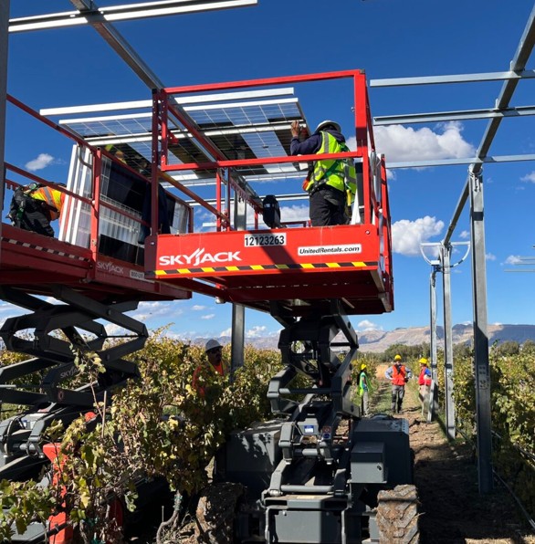 Solar panels are designed to protect the grapevines while also generating electricity. This system will help us study how solar panels can support crop growth, yield, and produce clean energy at the same time.