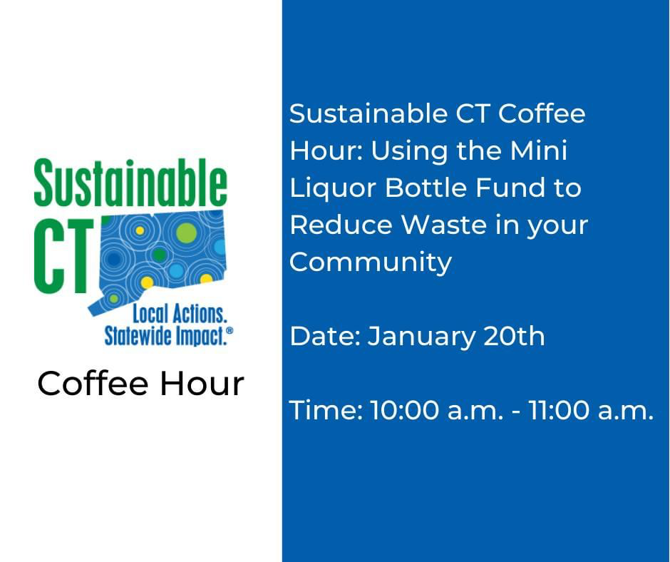 January 20, 2023 - 10:00am - 11:00am- Using the Mini Liquor Bottle Fund to Reduce Waste In Your Community. A Sustainable CT Coffee Hour Register here. Hosted by Sustainable CT. Virtual.