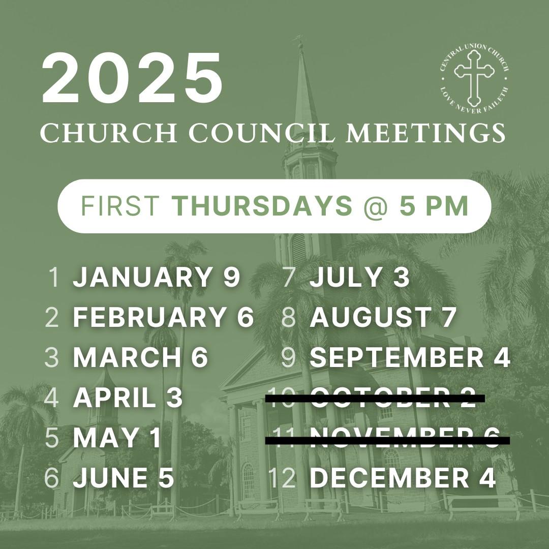 NOTE: The November Council meeting has been canceled. The last Council meeting for 2025 will be on December 4 at 5:00 PM in the Rewick Board Room in the Admin Building. These regular monthly Council meetings are open to all Church members who wish to attend as an observer. In 2026, Council meetings will be held on the 4th Thursday of the month.