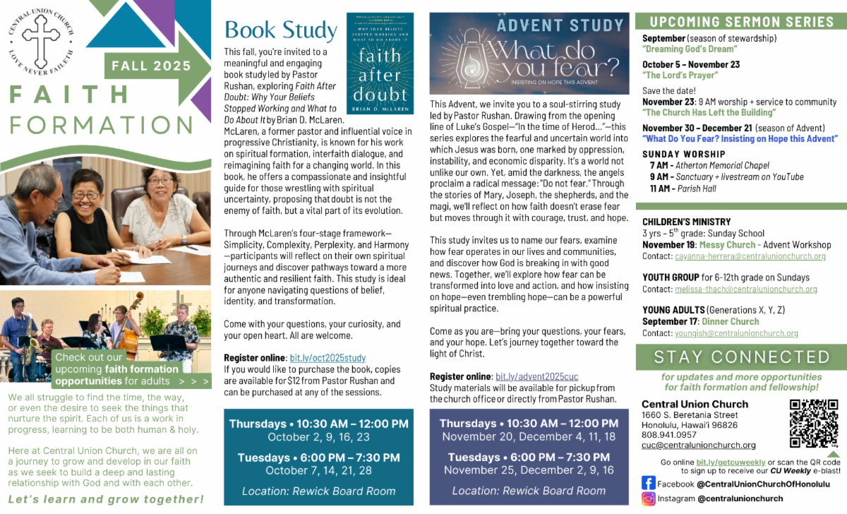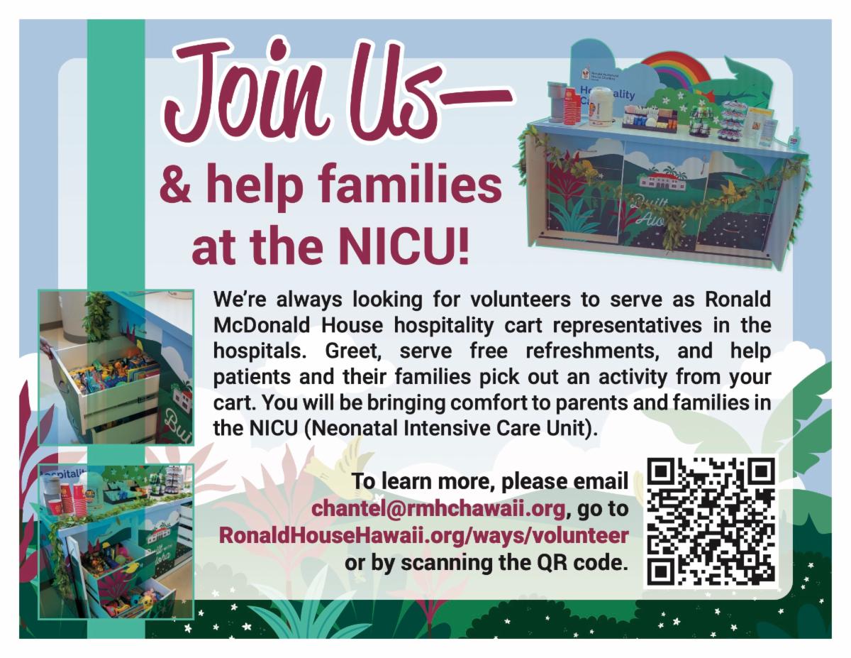 | | More Faith Formation for Fall 2025 | | Check out all the upcoming opportunities for faith formation this fall! We'll share more as events approach, but see for yourself what's coming up and plan to join us! | | Volunteer in the Community | | The Ronald McDonald House Hawai‘i has a hospitality cart located on the 4th floor at the Kapi‘olani Medical Center next door to our church. The cart offers complimentary coffee, tea, water, snacks, toys, and activities for families on the NICU, PICU, and Pediatric Units. The cart is open Monday through Friday from 10:00 AM – 12:00 PM. They are in need of volunteers to help run the cart during the week for a 3-hour shift. If you are interested to help with this and learn more, CLICK HERE or email chantel@rmhchawaii.org. | | | | |