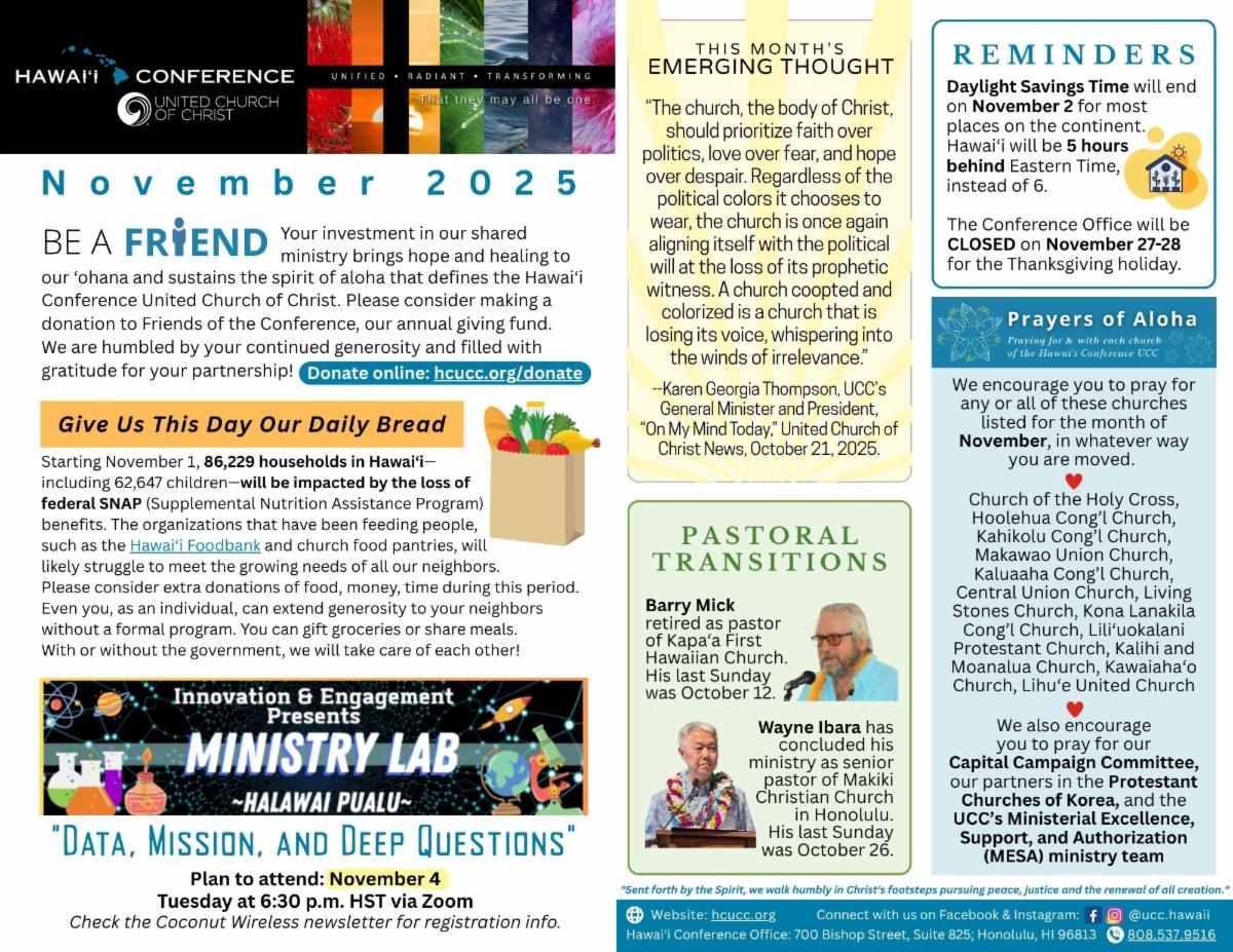 | | The Coconut Wireless is a weekly e-newsletter of what is happening in and around the Hawai‘i Conference United Church of Christ. Get word on the latest news, events, learning opportunities, and more. Connect, share news and resources with sister churches. | | WEEKLY VOLUNTEER OPPORTUNITIES | | | | |