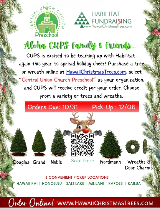 | | | Save the date for Messy Church! | | Our next Messy Church is scheduled for Wednesday, November 19 from 5:00-7:00 PM and will be extra special as we are combining it with our annual Advent Workshop. Advent is our season of preparation for the Mystery of Christmas so let's get ready to get ready! Join us as we create our Advent wreaths and special treats to celebrate the Advent season with friends and family! | | Messiah rehearsals start this evening! | | | | For over 75 years, Central Union Church’s Music Ministry has welcomed the community to their presentation of Handel’s Messiah, happening this year on December 14 at 7:30 PM. All singers are welcome to join this community ensemble, The Hawai‘i Nui Chorale, which is dedicated to the performance of extended choral works. Rehearsals are on Thursdays from 6-8 PM in the Music Room, starting on October 30. Click HERE for more info and pre-registration. | | Last chance! Order your holiday greens! | Support Central Union Church Preschool by ordering your Christmas trees, wreaths, and door charms through Habilitat. They will be available for pickup on December 6 at one of six locations around the island, including Central Union. Order by October 31! | | | | |