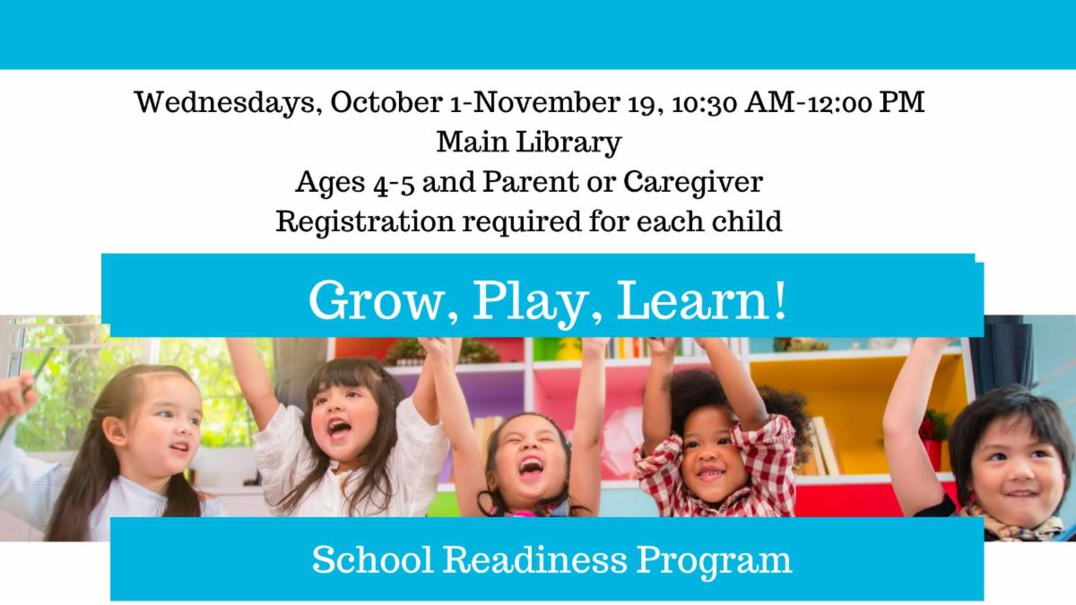 Grow, Play, Learn with Glendale Public Library's School Readiness Program. During this eight-week program, 4- and 5-year-olds will learn basic knowledge for school through stories, songs, and games. Caregivers will learn tips to support their children at home and prepare them for success in school.
