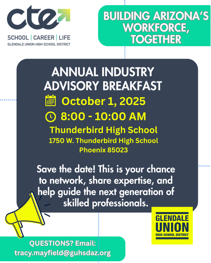 The Glendale Union High School District invites you to the Annual Industry Advisory Breakfast on Wednesday, October 1, from 8:00 a.m. to 10:00 a.m. at Thunderbird High School. Join us to network, share your expertise, and support Career and Technical Education (CTE) programs that prepare students across the district to become the future of Arizona’s workforce.